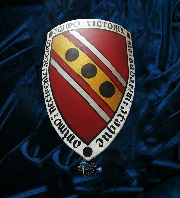 Every knight has His own Coat of arms, either inherited from the family, or granted to Him by the authority He is sworn to. That symbols and colors are then displayed on all the elements of the knight’s equipment. I adore to paint them on the shields. My sworn brother Juraj, entrusted me with painting His coat of arms on His shield, and I am so grateful for that.